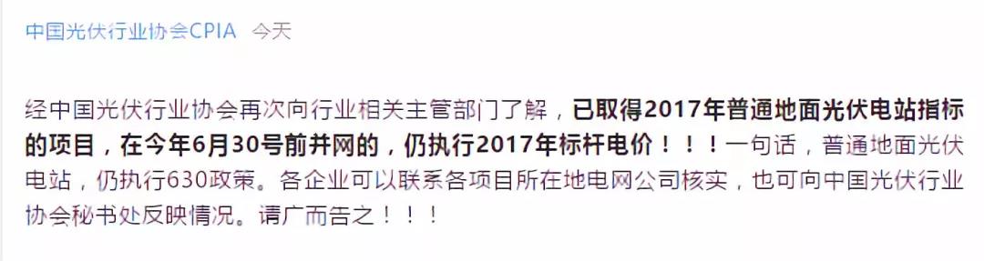 經(jīng)中國光伏行業(yè)協(xié)會再次向行業(yè)相關主管部門了解,已取得2017年普通地面光伏電站指標的項目,在今年6月30號前并網(wǎng)的,仍執(zhí)行2017年標桿電價!??!一句話,普通地面光伏電站,仍執(zhí)行630政策。