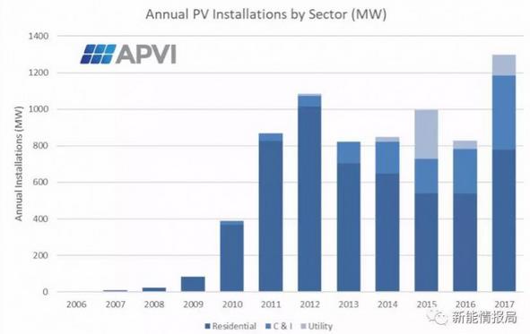 從2012-2016,澳大利亞的戶用裝機(jī)量一直在下滑,但是在2017年卻增長(zhǎng)了44%,由541MW增加到了779MW。
