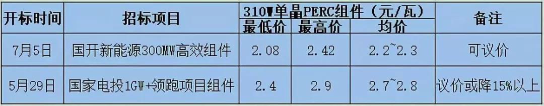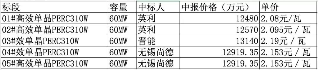 此前,根據(jù)國開能源關(guān)于此項(xiàng)目的開標(biāo)結(jié)果來看,高效單晶PERC310W的報(bào)價(jià)絕大部分集中在2.2~2.3元每瓦之間。中標(biāo)結(jié)果則顯示單晶PERC310W的均價(jià)約為2.14元/瓦,最高中標(biāo)價(jià)格亦未超過2.2元/瓦。