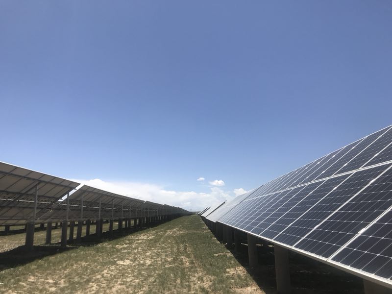在青海省海南州共和縣光伏發(fā)電園區(qū)里,放眼望去,一排排藍(lán)色光伏板排列整齊,在陽(yáng)光下熠熠生輝。2018年6月30日,100MW集中式光伏扶貧電站實(shí)現(xiàn)并網(wǎng)發(fā)電。