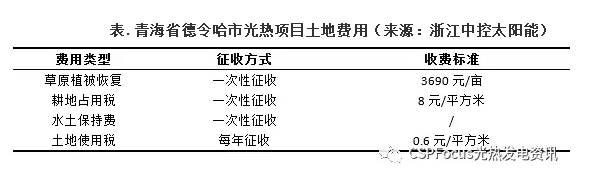 如上圖表所示,以浙江中控太陽能在青海德令哈的光熱電站為例,按照上述收費(fèi)標(biāo)準(zhǔn),一個年發(fā)電量兩億度左右的50MW塔式電站,占地面積約3.3平方公里,需要繳納的草原植被恢復(fù)費(fèi)約1800萬元,耕地占用稅2700萬元,水土保持費(fèi)另算,土地使用稅(按25年期限)可高達(dá)5000萬元。若再加上牧民安置等其他費(fèi)用,僅土地一項(xiàng)的支出就已經(jīng)逼近上億元。