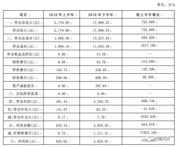 因此,2016年上半年已經(jīng)公布的報(bào)表在2017年顯然是不能也不好大幅改動(dòng)了,所以就只能讓2016年下半年“做文章”,實(shí)現(xiàn)業(yè)績(jī)暴漲(江蘇鼎陽(yáng)在2017年4月終止掛牌,2016年年報(bào)最終未公布)。