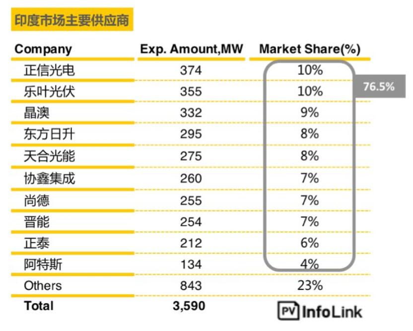 根據(jù)2018上半年中國海關(guān)組件出口統(tǒng)計(jì),印度市場前十大中國組件供應(yīng)商共占中國出口印度總量76.5%的組件份額。