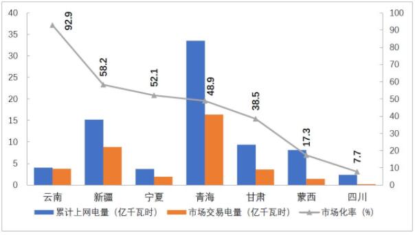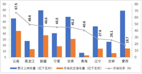 分省來看,市場交易電量占全社會用電量比重排序前三名的省份是云南、蒙西和江蘇,分別為49.4%、46.1%、44.5%;電力市場交易電量規(guī)模排序前三名的省份分別為江蘇1286億千瓦時(shí)、山東768億千瓦時(shí)、廣東599億千瓦時(shí);外受電市場交易電量排序前三名的省份分別是江蘇286億千瓦時(shí)、山東242億千瓦時(shí)和浙江160億千瓦時(shí)。