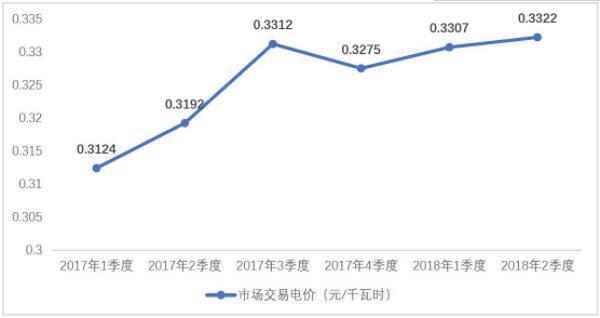 2017年以來,隨著煤炭市場價(jià)格波動拉升以及市場交易的理性回歸,煤電市場交易電價(jià)呈緩步回升趨勢。2018年2季度,大型發(fā)電集團(tuán)煤電市場交易平均電價(jià)為0.3322元/千瓦時(shí),同比回升4.07%。