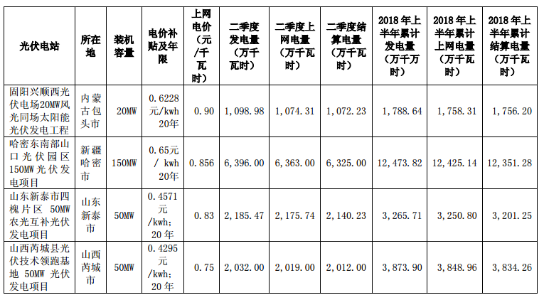 特變電工2018年半年度光伏電站經(jīng)營數(shù)據(jù)公告