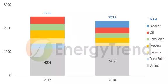 比對1H17與1H18從中國出口到日本的組件量可發(fā)現(xiàn),1H17中國對日出貨量為2,503MW,出貨量最多的是日本京瓷;但在1H18,京瓷已被中國廠商擠到第4名,第一名寶座由晶澳太陽能奪下。此外,比對JPEA所公布的出貨數(shù)據(jù),1H17日本市場共出貨3,132MW,1H18則出貨2,592MW,明顯可見中國制組件的市占率往上提升。