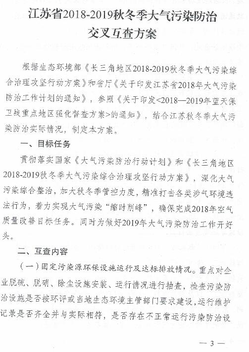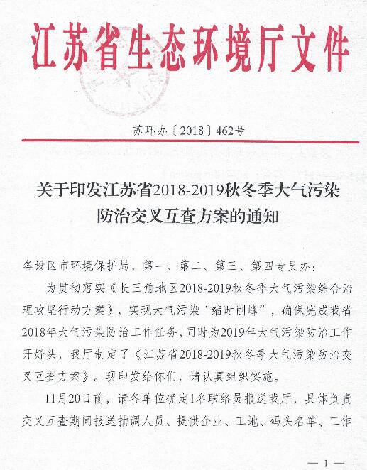 關于印發(fā)江蘇省2018-2019秋冬季大氣污染防治交叉互查方案的通知