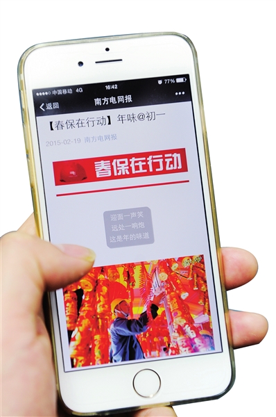 網(wǎng)內(nèi)員工通過微信公眾號關(guān)注春保。本報記者李志杰攝自1月30日起,《南方電網(wǎng)報》連續(xù)推出了春保在行動系列專題報道,南方電網(wǎng)官方微信——南網(wǎng)50Hz,南方電網(wǎng)報微信微博同步跟進,持續(xù)關(guān)注各地一線基層供電員工的