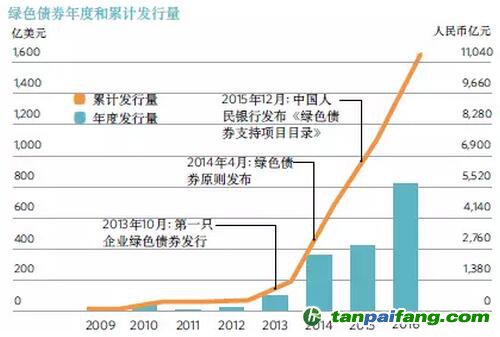 圖2:綠色債券年度和累計發(fā)行量(2009-2016)【注13】