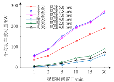 各國(guó)電力系統(tǒng)對(duì)光伏并網(wǎng)功率的波動(dòng)性要求不完全相同,如波多黎各電力局對(duì)功率波動(dòng)要求是小于±10%/min,墨西哥電力局要求將功率波動(dòng)控制在±1%~±5%/min范圍內(nèi)[3]。在圖2的統(tǒng)計(jì)結(jié)果基礎(chǔ)上,圖3繪制了在不同時(shí)間尺度(1—30 min)下功率波動(dòng)的變化趨勢(shì)。整體來(lái)看,隨著時(shí)間窗口的增大,功率波動(dòng)量也隨著增大。多云天氣下的功率波動(dòng)明顯比晴天和陰天下波動(dòng)幅度大。另外,在多云天氣下,風(fēng)速越大,功率的波動(dòng)量也越大,因?yàn)轱L(fēng)速越大,云的移動(dòng)速度也越大,遮擋太陽(yáng)的頻率增大。此外,晴天和陰天環(huán)境下,功率波動(dòng)量和風(fēng)速之間的相關(guān)性較小。