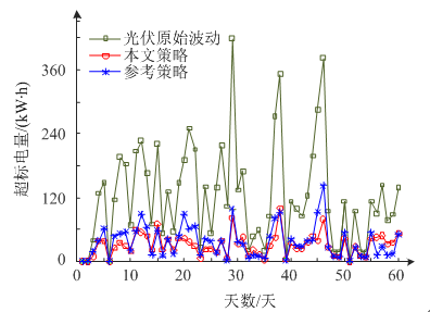 計(jì)算得出光伏原始功率超標(biāo)電量、經(jīng)本文策略以及經(jīng)參考策略平抑后的超標(biāo)電量的平均值分別為:123.27 kW•h/天、31.67 kW•h/天、37.39 kW•h/天。從超標(biāo)電量的均值來(lái)看,本文所提策略和參考策略都能有效地平抑光伏功率波動(dòng),但本文策略超標(biāo)電量的平均值更小,平抑效果更好。