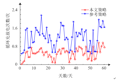 2種策略下儲(chǔ)能電池每天的循環(huán)充放電次數(shù)分布情況如圖12所示。從仿真結(jié)果可直觀地看出本文所提策略能顯著降低儲(chǔ)能電池的充放電次數(shù),對(duì)
