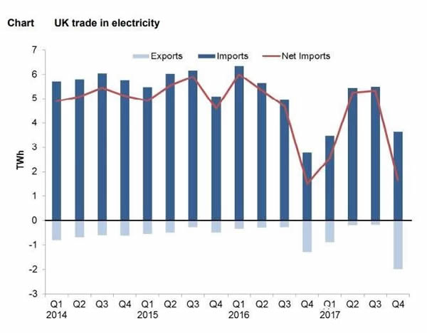 英國(guó)本土發(fā)電量為3350千瓦時(shí),凈進(jìn)口量為148億千瓦時(shí),比2016年下降15.6%。進(jìn)口下降的主要原因是英法聯(lián)網(wǎng)線路在2017年第一季度發(fā)生故障,加上2017年第4季度法國(guó)核電站的維修。