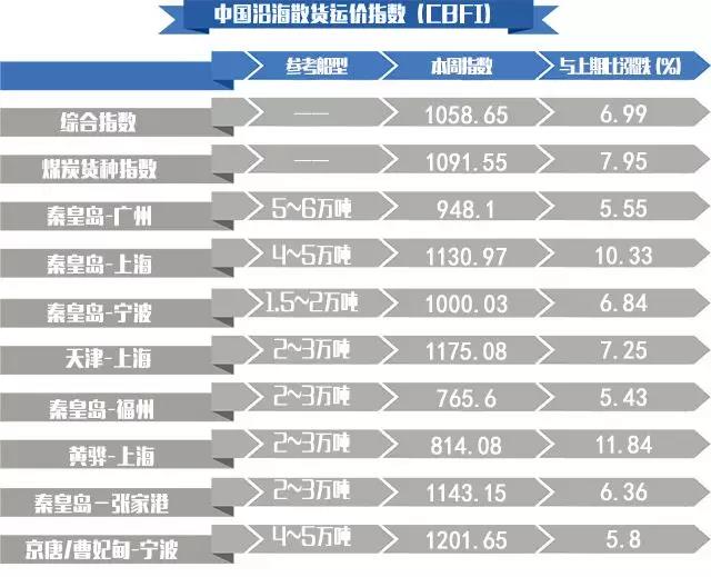 • 中國(guó)沿海(散貨)綜合運(yùn)價(jià)指數(shù)報(bào)收1058.65點(diǎn),較上周上漲7.0%。