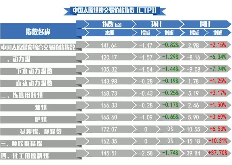 第246期中國(guó)太原煤炭綜合交易價(jià)格指數(shù)為141.64點(diǎn),環(huán)比下跌0.82%。其中:動(dòng)力煤指數(shù)120.47點(diǎn),環(huán)比下跌1.29%;煉焦用精煤指數(shù)168.73點(diǎn),環(huán)比下跌0.25%;噴吹用精煤指數(shù)162.35點(diǎn),環(huán)比持平;化工用原料煤指數(shù)145.51點(diǎn),環(huán)比下跌1.74%。