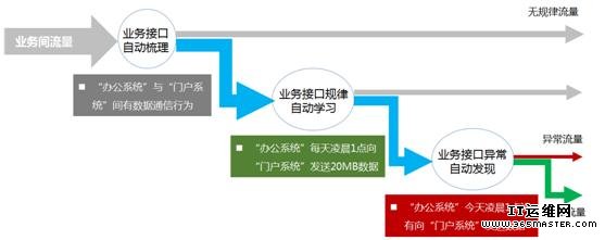 北塔軟件的做法是采用了大數(shù)據(jù)分析處理技術(shù),再配合一個“獨家秘方”的業(yè)務(wù)接口通信規(guī)律算法,在無須人工干預(yù)的情況下,自動梳理業(yè)務(wù)間存在的接口、自動學(xué)習(xí)業(yè)務(wù)間接口通信規(guī)律、自動發(fā)現(xiàn)業(yè)務(wù)間接口通信異常。
