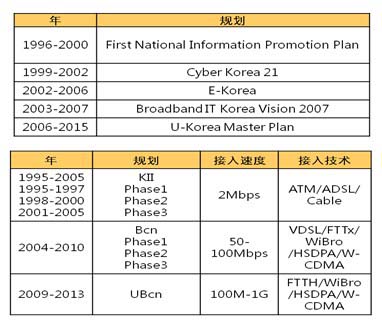 韓國政府是制定國家寬帶規(guī)劃和成功執(zhí)行規(guī)劃的表率。韓國的寬帶規(guī)劃隸屬于國家信息化規(guī),國家信息化規(guī)劃重要的階段包括Cyber Korea 21,e-Korea,U-Korea等,如下圖所示。國家寬帶主要規(guī)劃內(nèi)容如下,在不同階段規(guī)劃了詳細的接入技術、接入速度,對后期執(zhí)行起到了比較好的指導作用,韓國國家規(guī)劃時間周期比較長,分階段規(guī)劃,總周期達到20年,更難得的是堅持落實,完成了規(guī)劃目標。