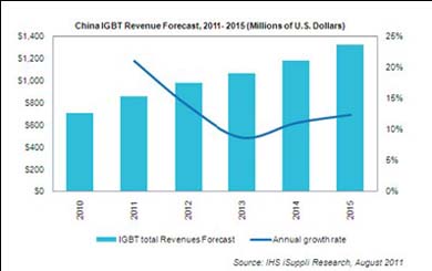 隨著IGBT技術(shù)的發(fā)展,IGBT已經(jīng)從工業(yè)擴(kuò)展到消費(fèi)電子應(yīng)用,成為未來10年發(fā)展最迅速的功率半導(dǎo)器件;而在中國市場,軌道交通、家電節(jié)能、風(fēng)力發(fā)電、太陽能光伏和電力電子等應(yīng)用更是引爆了IGBT應(yīng)用市場。據(jù)IHS iSuppli公司中國研究服務(wù)即將發(fā)表的一份報告,由于綠色能源與能源效率得到更多的重視,以及政府投資支持和嚴(yán)格的能源政策,2011-2015年中國絕緣柵雙極型晶體管(IGBT)市場銷售額的復(fù)合年度增長率將達(dá)13%。2011年IGBT銷售額將達(dá)到8.59億美元,2015年有望達(dá)到13億美元,如下圖所示。與其它MOSFET等其它分立功率元件相比,中國IGBT銷售額增長強(qiáng)勁。