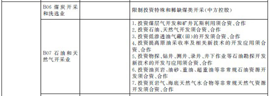 煤炭、天然氣方面:限制投資特殊和稀缺煤類開采(中方控股)。投資煤層氣、頁巖氣、石油、天然氣、可燃冰等須合資、合作。投資石油勘探開發(fā)技術(shù)須合資、合作。投資非常規(guī)石油、非常規(guī)天然氣資源勘探須合資、合作。
