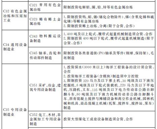 能源設(shè)備制造方面:限制投資部分通用設(shè)備、采礦專用設(shè)備制造。投資大型煤化工成套設(shè)備制造須合資、合作。