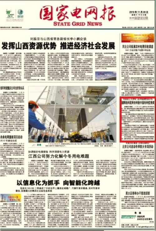 2010年11月20日,國家電網(wǎng)報頭版報道國網(wǎng)電科院兩項專利獲中國專利優(yōu)秀獎。 詳見:http: epaper indaa com cn html 2010-11 20 content_252589 htm
