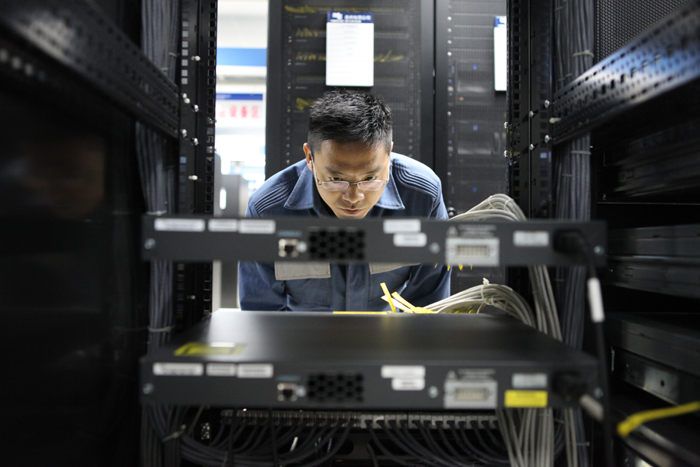 一般人認(rèn)為,上網(wǎng)就是接一根網(wǎng)線到電腦上就可以了,其實(shí)這僅僅是最后的一步,之前還需要做大量的工作,袁忠軍給記者講解到。辦公網(wǎng)絡(luò)環(huán)境,包括核心區(qū)域交換機(jī)、服務(wù)器區(qū)域交換機(jī)、匯聚交換機(jī)、綜合交換機(jī)、接入交換機(jī)、安全設(shè)置、各類應(yīng)用系統(tǒng)、終端(電腦)等等,每一臺(tái)電腦要通過(guò)一系列的認(rèn)證、授權(quán)、審計(jì)才能順利的連接到互聯(lián)網(wǎng)和局域網(wǎng),其中某個(gè)環(huán)節(jié)出現(xiàn)問(wèn)題,將導(dǎo)致用戶不能順利使用網(wǎng)絡(luò),這時(shí)就需要他們的維護(hù)和搶修。