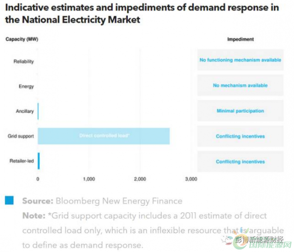 需求響應(yīng)在澳大利亞國家電力市場(NEM)中面臨的主要阻礙在于難以進入電力批發(fā)市場,而各大電廠的供電刺激措施也互相矛盾。NEM缺乏其它市場中需求響應(yīng)資源廣泛存在所須具備的兩大關(guān)鍵因素:容量電費或可用性費用以及第三方電力集成商的參與。而NEM目前只針對不可調(diào)度的需求響應(yīng)的參與提供刺激措施,但這一做法并無多大意義。