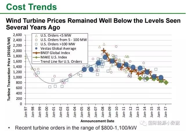 # 2008年以來美國風機價格明顯下降,目前在800-1100美元/千瓦左右。這樣,一個2兆瓦的風機售價在160-220萬美元之間。2016年風電系統(tǒng)裝機成本約為1590美元/千瓦。