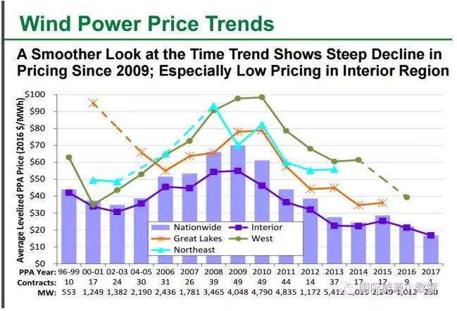 # 2009年風電售電協(xié)議(PPA)價格平均約為70美元/兆瓦時,到2016年已經(jīng)降至20美元/兆瓦時;風電已經(jīng)可與天然氣發(fā)電競爭。