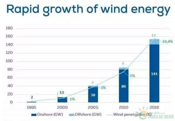 根據(jù)Wind Europe的數(shù)據(jù),過(guò)去20年來(lái)風(fēng)電在歐洲(歐盟28國(guó))迅速發(fā)展。到2016年底,歐洲國(guó)家風(fēng)電裝機(jī)已經(jīng)達(dá)到154吉瓦,其中13吉瓦為海上風(fēng)電;2016年風(fēng)電占發(fā)電量的比例達(dá)到10.4%。