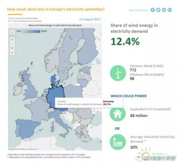 Wind Europe還跟蹤監(jiān)測(cè)歐盟28國(guó)每天的風(fēng)電發(fā)電情況。2017年8月12日這一天,歐洲風(fēng)電占比12.4%,其中德國(guó)風(fēng)電占比26.5%。