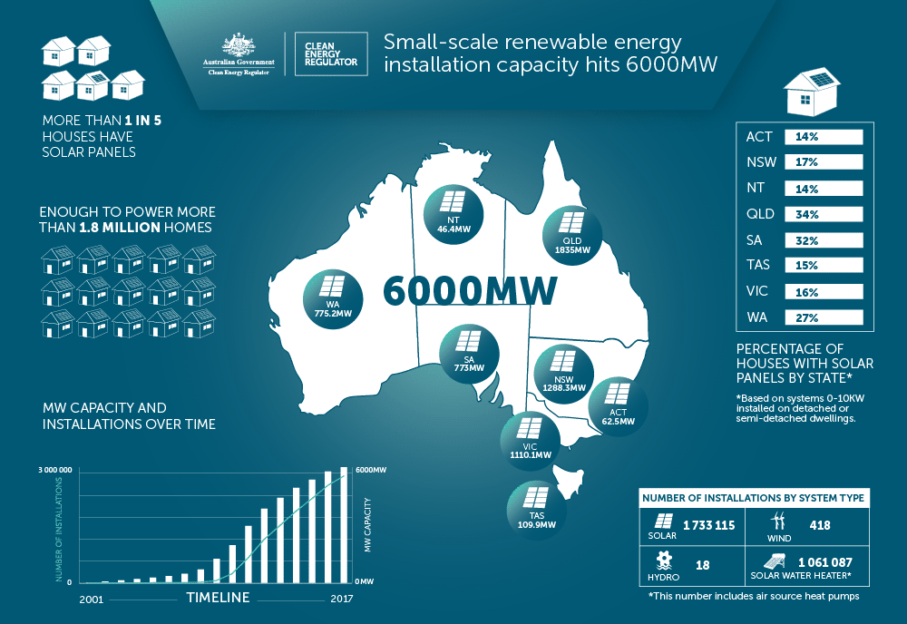 澳洲聯(lián)邦政府清潔能源監(jiān)管局(CER)近日公布,目前澳洲小型可再生能源項目裝機量已達到6000兆瓦,可為180萬戶家庭提供足夠的電力。CER表示,小型可再生能源項目是指發(fā)電量不超過100千瓦或不超過家庭項目平均裝機