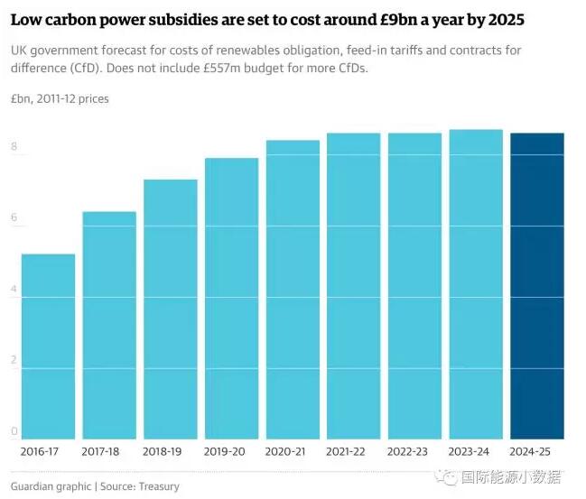 英國財政部在日前公布財政預(yù)算文件中披露,“為了維護消費者的利益”,在2025年以后將停止對于新建的可再生能源項目的各種財務(wù)補貼,包括可再生能源強制配額、固定上網(wǎng)電價、差價合同等。當然,這一決定不會影響2025年以前的可再生能源項目的持續(xù)補貼。英國財政部估算,到2025年對已經(jīng)投入運行的項目補貼將達到每年90億英鎊。