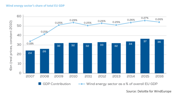 盡管如此,2016年,歐洲風(fēng)能產(chǎn)業(yè)為歐盟GDP創(chuàng)收361億歐元,占?xì)W盟GDP總量的0.26%。