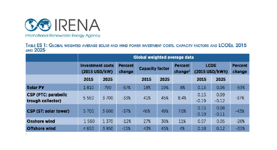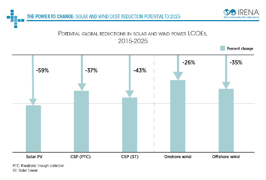 根據國際可再生能源署(IRENA)發(fā)布的報告預測,光伏、光熱、陸上和海上風電成本將大幅度下降,到2025年的十年期間,度電成本將分別下降26%-59%不等。
