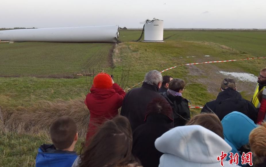法國內(nèi)政部建議受風(fēng)暴影響地區(qū)的人員盡量減少出行,如果必須出行應(yīng)盡量降低車速,并注意不要觸碰掉落在地的電線。圖為當(dāng)?shù)孛癖妵^被吹斷的風(fēng)力發(fā)電機(jī)。