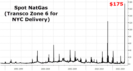 據(jù)外媒,用于供暖和發(fā)電的現(xiàn)貨天然氣在紐約地區(qū)觸及175美元/百萬英熱單位,近四年內(nèi)價格暴漲了60倍,而全美基準(zhǔn)的亨利官網(wǎng)中樞管輸天然氣現(xiàn)貨均價僅為2.93美元/百萬英熱單位。
