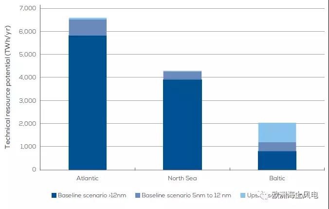 歐洲各國從離岸5海里到專屬經(jīng)濟區(qū)(EEZ)的所有海域所包含的風能資源,按每平方公里5.36MW的密度計算。
