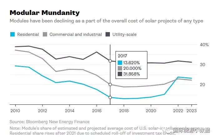 值得注意的是,光伏組件只是光伏系統(tǒng)的一部分。以大型地面光伏電站為例,2010年光伏組件占系統(tǒng)成本的38.8%,而2017年這一比例為31.8%;BNEF預(yù)計(jì)2023年光伏組件將占地面大型光伏電站總成本的31.2%,與2017年相比沒有明顯變化。對于屋頂光伏而言,2010年光伏組件占系統(tǒng)成本的29.3%,而2017年這一比例跌至13.6%;BNEF預(yù)計(jì)2023年光伏組件將占屋頂光伏總成本的的23.2%。
