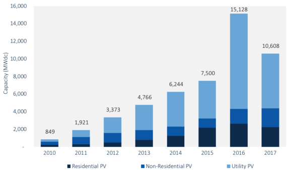 根據(jù)GTM Research和太陽能行業(yè)協(xié)會(huì)的新報(bào)告,2017年美國太陽能光伏市場新增10.6吉瓦的容量,比2016年下降了10%。