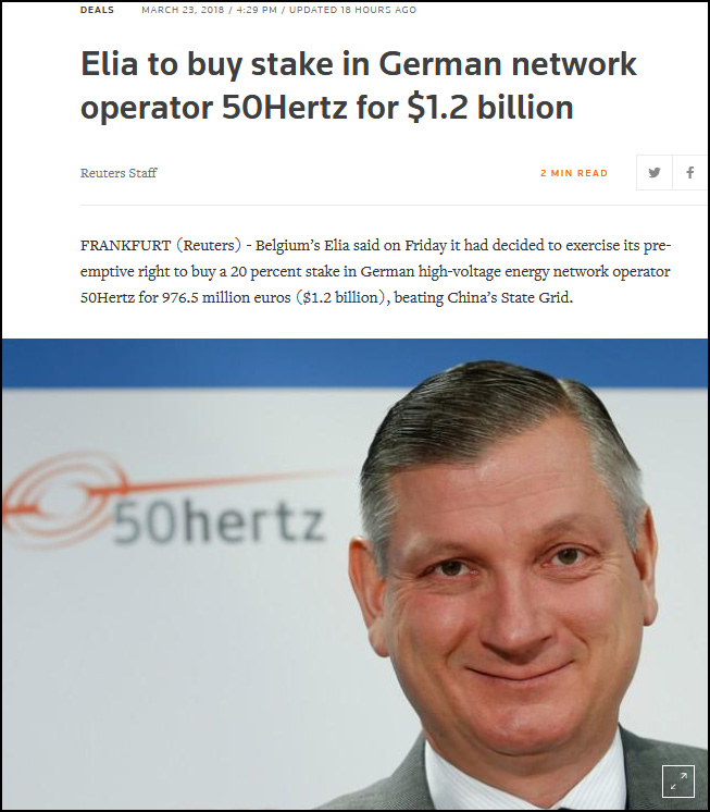 據(jù)路透社3月24日報道,比利時電網(wǎng)運營商Elia23日表示,它已決定行使其優(yōu)先購買權(quán),以9.756億歐元(12億美元)收購德國高壓電網(wǎng)運營商50Hertz20%的股份。此舉令中國國家電網(wǎng)投資德國電網(wǎng)的努力受挫。