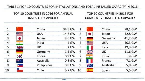 對比2016年全球新增裝機(jī)和累計裝機(jī)排名前10的國家(如下圖所示)可以看出,2017年,以中國、印度的亞洲市場新增裝機(jī)保持快速增長,并成為支撐全球光伏擴(kuò)張的重要力量,而以美國、德國為代表的歐美地區(qū)國家新增裝機(jī)則普遍出現(xiàn)增速放緩甚至負(fù)增長。此外,巴西、澳大利亞等新興市場開始嶄露頭角,增長勢頭較為明顯。