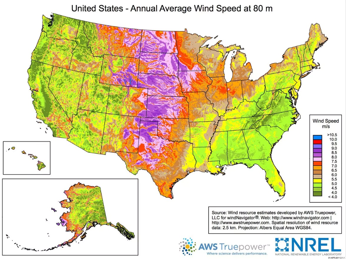 另一方面,有2,501個縣幾乎沒有任何商業(yè)風能可言。這有很多原因,其中之一是地理條件單一。美國的年平均風速有很大的變化,如美國能源部下面的地圖所示,風速在80米左右,接近典型風力發(fā)電機的高度。尤其是東南部,相對于該國其他地區(qū)而言實際上是一片風沙。因此,該地區(qū)幾乎沒有商業(yè)風力發(fā)電項目。
