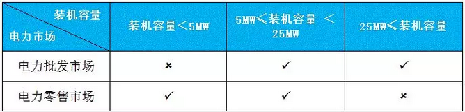 根據(jù)《電力法》規(guī)定,發(fā)電人能參與電力批發(fā)市場還是電力零售市場,主要取決于其裝機(jī)容量。除因技術(shù)條件不具備等極個別特殊情形外,電站的裝機(jī)容量與其可以參與的電力市場存在如下表所示的對應(yīng)關(guān)系: