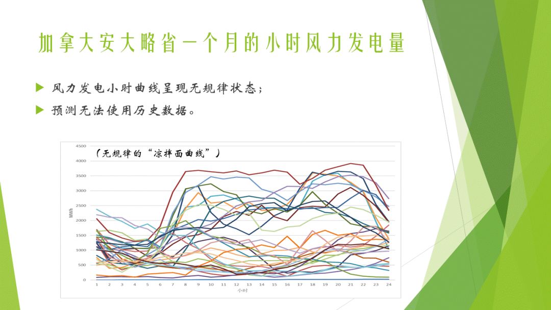以加拿大安大略省一個(gè)月的小時(shí)風(fēng)力發(fā)電量數(shù)據(jù)為例,可以看到風(fēng)力發(fā)電小時(shí)曲線呈現(xiàn)無規(guī)律狀態(tài)。這意味著,在進(jìn)行預(yù)測(cè)時(shí),無法利用歷史數(shù)據(jù)。