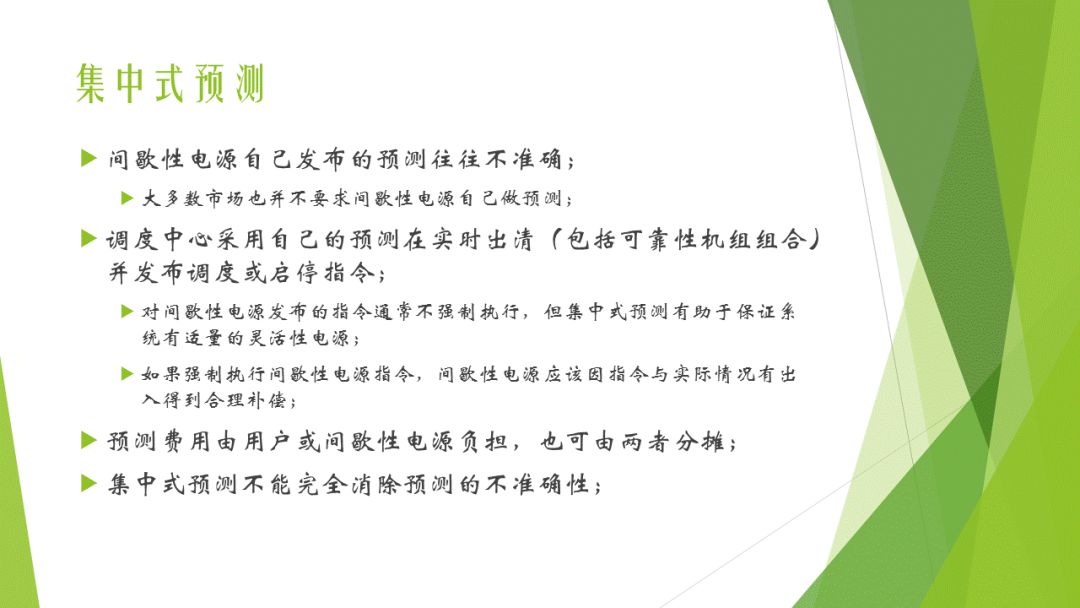 對(duì)間歇性電源,可以采用由調(diào)度機(jī)構(gòu)統(tǒng)一預(yù)測(cè)的方式以提高預(yù)測(cè)精度。多個(gè)電力市場(chǎng)采用這種方法。預(yù)測(cè)成本可以由市場(chǎng)通過一定方式分?jǐn)偝鋈ァ?/p>