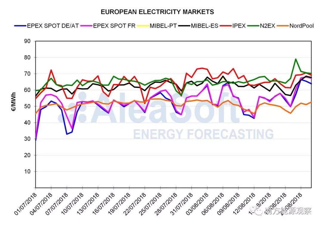 過(guò)去幾周,歐洲幾個(gè)主要電力批發(fā)市場(chǎng)的電價(jià)一直持續(xù)上漲。以中西歐的德法市場(chǎng)為首,西南歐的MIBEL(西班牙和葡萄牙)市場(chǎng)、英國(guó)市場(chǎng)、意大利市場(chǎng)(IPEX)甚至北歐市場(chǎng)(Nord Pool)皆紛紛中招。