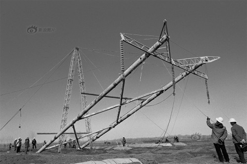 《吊車組立鐵塔》1985年,鄒縣發(fā)電廠經(jīng)濟(jì)南至濰坊山東省第一條500千伏超高壓輸電線路工人用吊車組裝鐵塔。