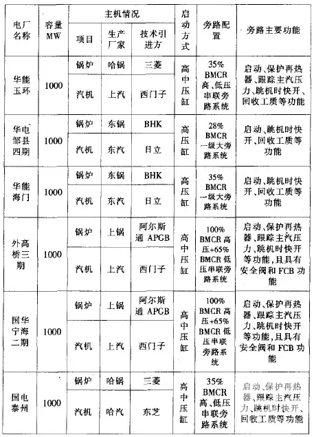 下表是國(guó)內(nèi)部分已投產(chǎn)或正在實(shí)施的百萬超超臨界機(jī)組旁路設(shè)置情況。